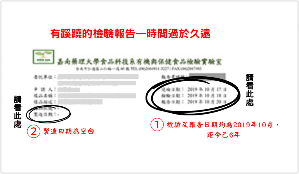 若檢驗報告上沒有明確的產品批號、有效日期或製造日期作為依據,廠商便可以將檢驗報告一用再用,如下圖,將一檢驗報告持續使用超過6年,報告早已非當初檢驗的商品。