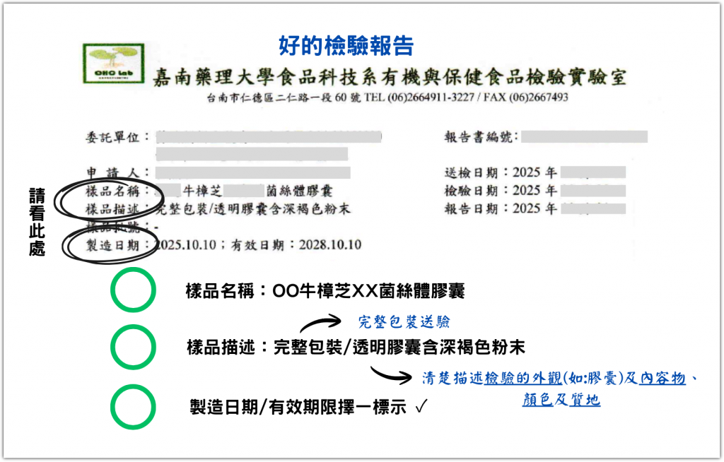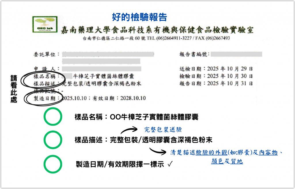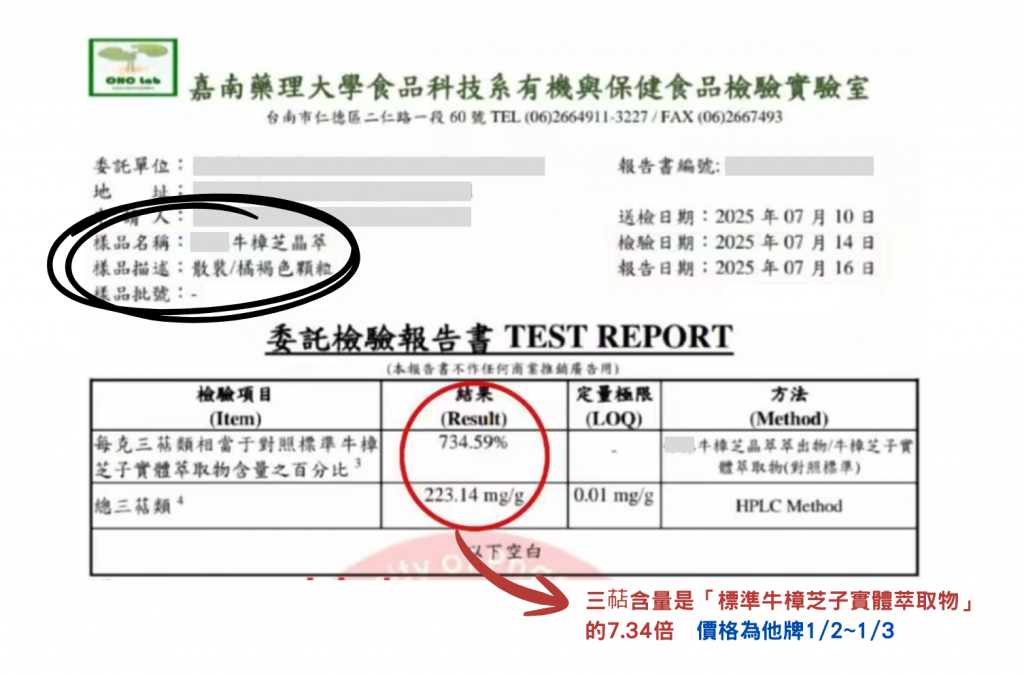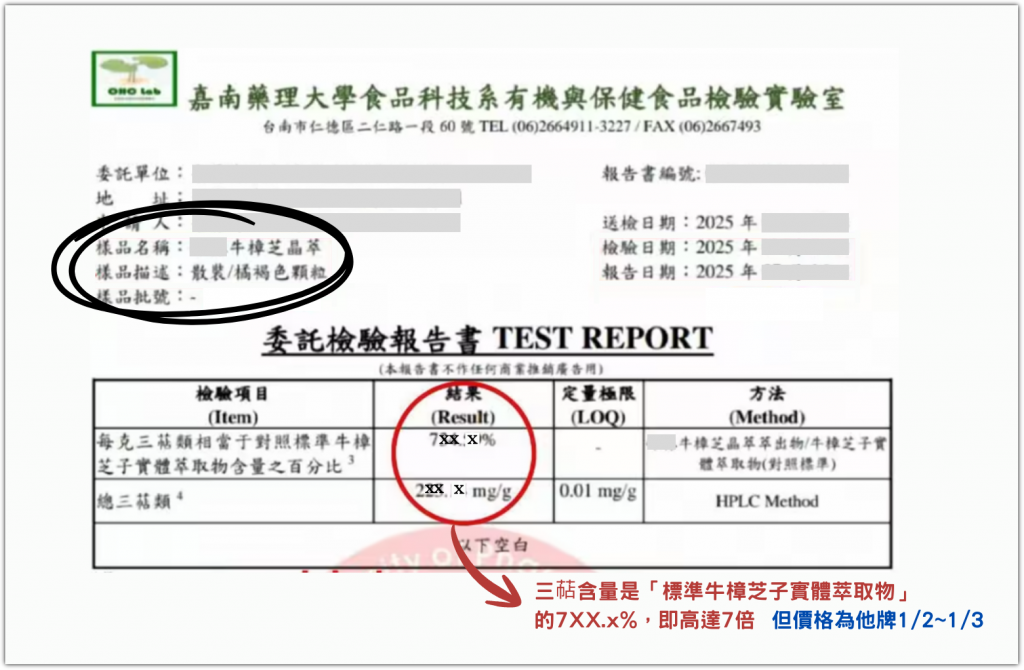所以選購時請細看商家提供的三萜檢測報告,報告上「樣品名稱」與「樣品描述」是否符合上述要求。如果不符合,可能就是移花接木的三萜報告,商家意圖使民眾誤以為所購買的產品為高濃度,實則不然。