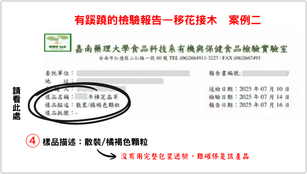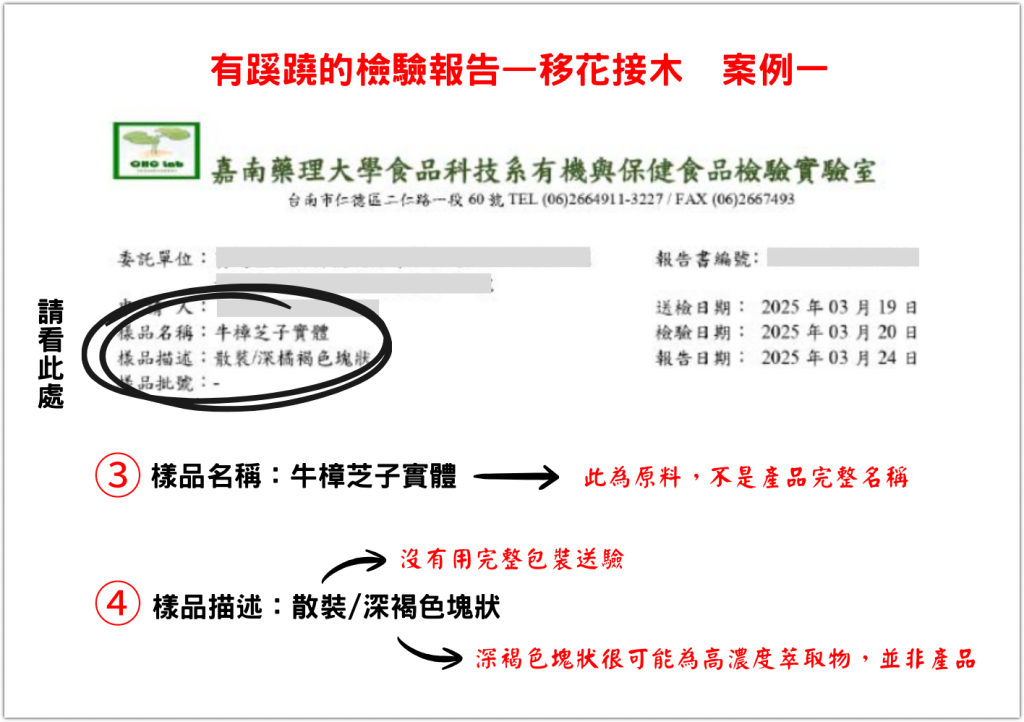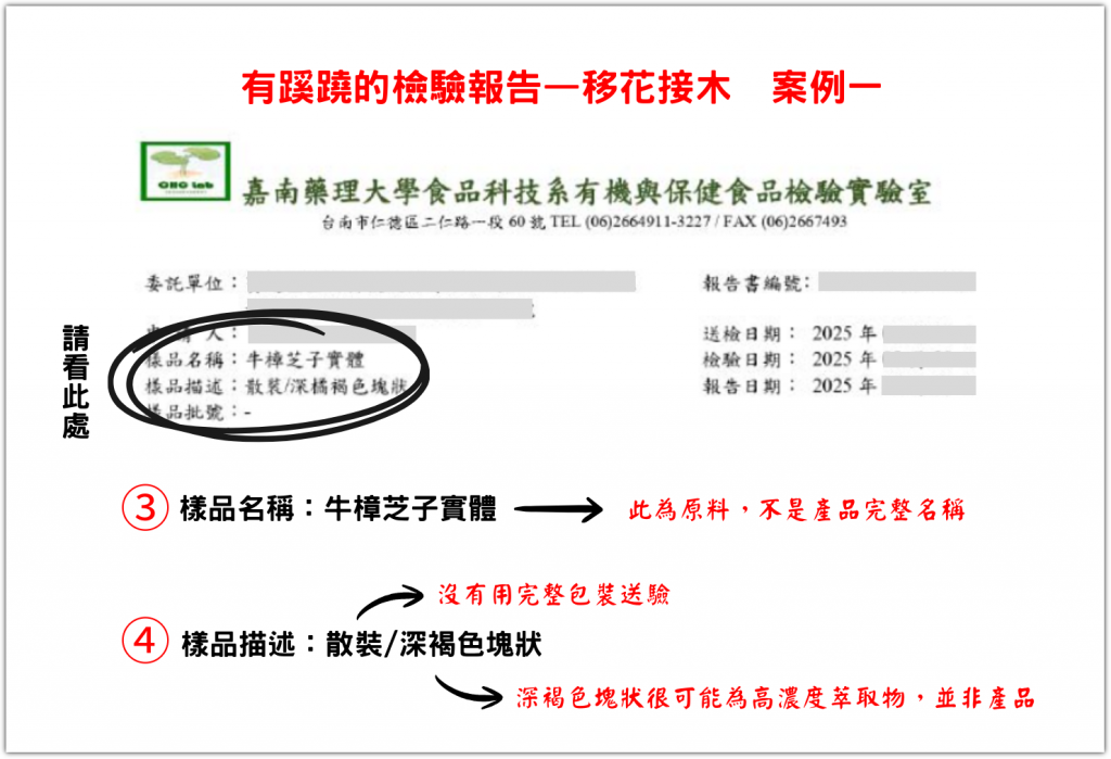 若樣品名稱非完整商品名稱,而是寫「固態培養牛樟芝」、「牛樟芝子實體」…,很可能是廠商故意移花接木。常見移花接木做法為:拿品質優的牛樟芝原料或特級品去送測取得高三萜值報告,再謊稱是自家販售的牛樟芝商品有此高三萜值表現。