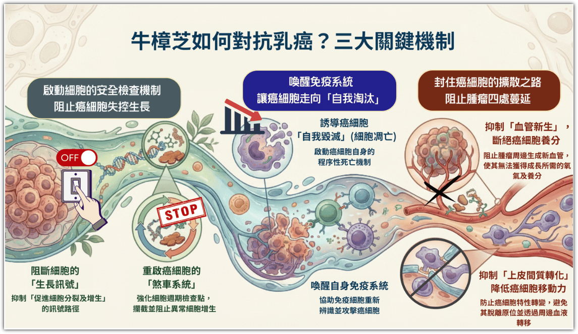研究發現牛樟芝可「調降關鍵細胞週期蛋白」,即是用踩煞車的方式來抑制乳癌細胞增生及分化,遏止細胞不正常的持續生長。