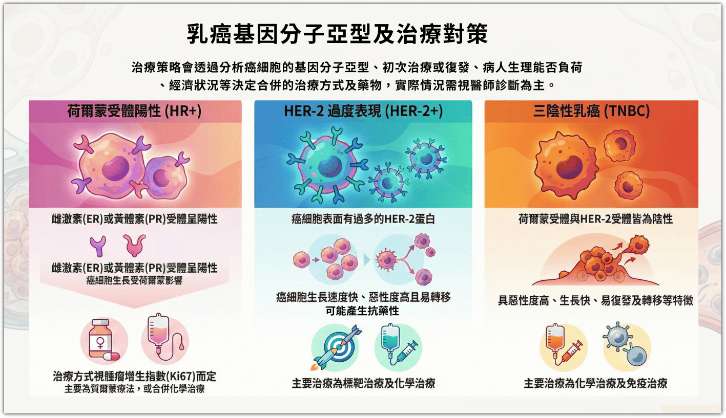 乳癌的治療方式目前有賀爾蒙療法、化學療法、標靶藥物與放射療法,醫師會依據病人的分子亞型而採用不同的治療。基因分類亞型可分為荷爾蒙受體(即雌激素ER或黃體素RR)是否陽性、HER-2受體是否過度表現或弱陽性,最後是賀爾蒙受體和HER-2受體皆為陰性。
